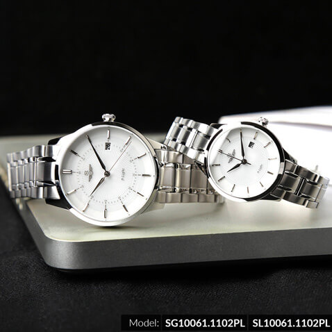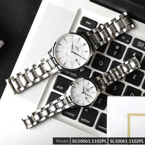 Đồng hồ cặp đôi SR10061.1102PL thiết kế mặt tròn truyền thống có vỏ máy bằng thép không gỉ kết hợp với dây đeo đờ mi bằng kim loại mạ sắc nét cùng nền số trắng trang nhã tạo nên tổng thể sang trọng, các cọc số mảnh và kim chỉ được mạ sáng bóng nổi bật, máy dùng công nghệ P-light thân thiện môi trường, tiết kiệm chi phí thay pin là mẫu đồng hồ cặp đáng có dành cho các cặp đôi yêu thích sự sang trọng, đẳng cấp.