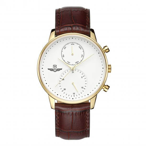 Đồng hồ nam SRWATCH SG5891.4602 mang phong cách thiết kế hiện đại với mặt số màu trắng, kim chỉ và vạch số được thiết kế thanh thoát và đơn giản, khung kim loại mạ vàng cùng quai đeo da màu nâu sang trọng.