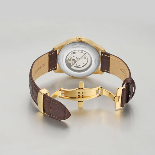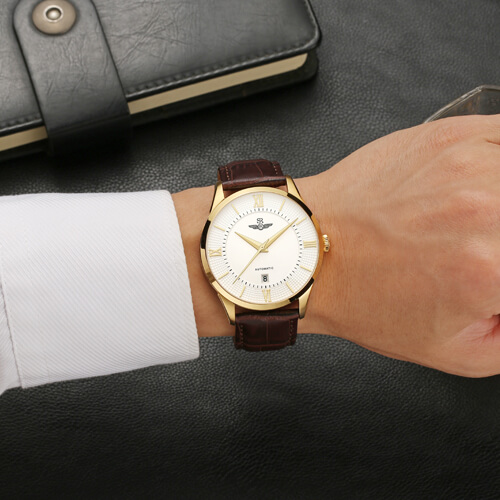 Đồng hồ nam SG8884.4602AT trắng với mặt đồng hồ tròn truyền thống, vỏ máy bằng thép không gỉ mạ vàng sang trọng kết hợp cùng dây da thật màu nâu có vân, cọc số và kim chỉ đều được mạ vàng nổi bật trên nền số trắng, mặt kính cong chống trầy, có 1 lịch ngày đi kèm.