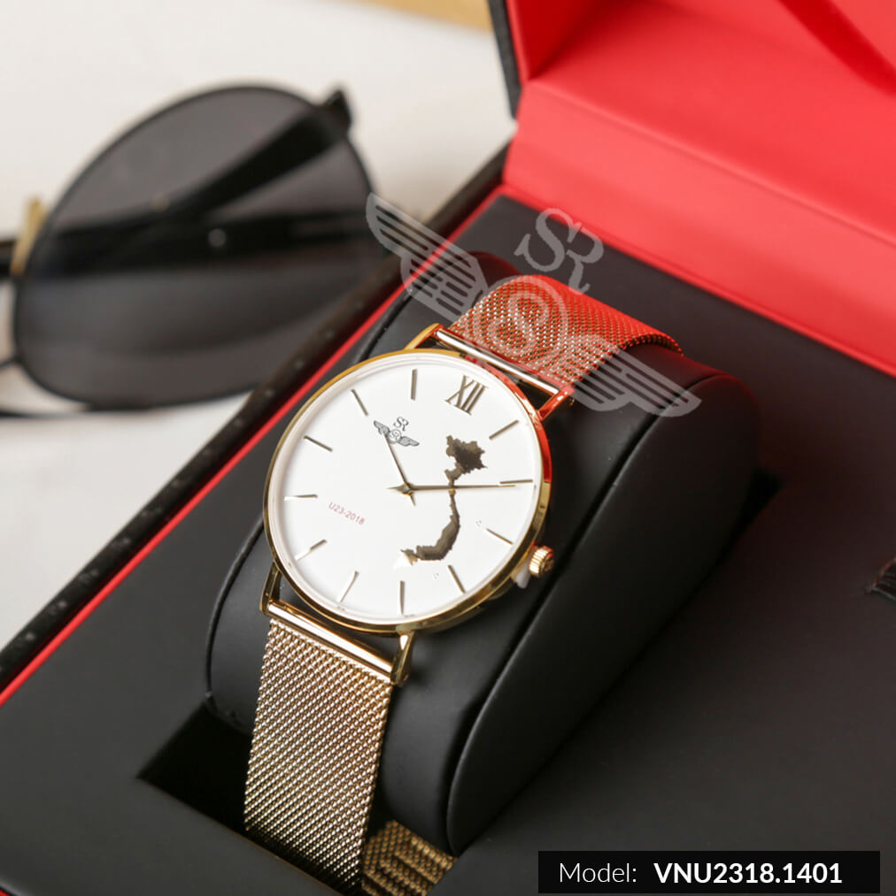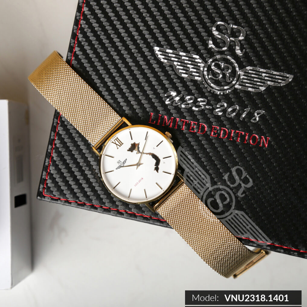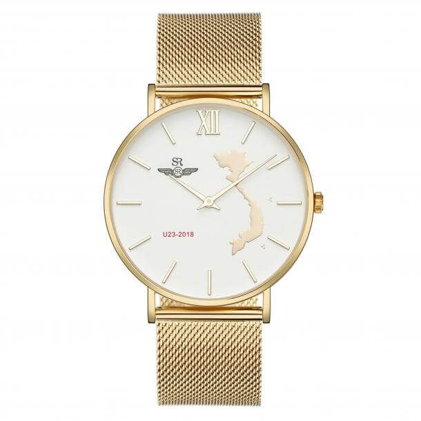 Đồng hồ nam SRWATCH VNU2318.1402 LIMITED EDITION là bản sản xuất giới hạn mừng chiến thắng của các cầu thủ u23 Việt Nam, với hình bản đồ mạ vàng sang trọng, trên mặt số khắc chữ u23 màu đỏ nổi bật, khung viền và quai đeo mạ vàng cao cấp.