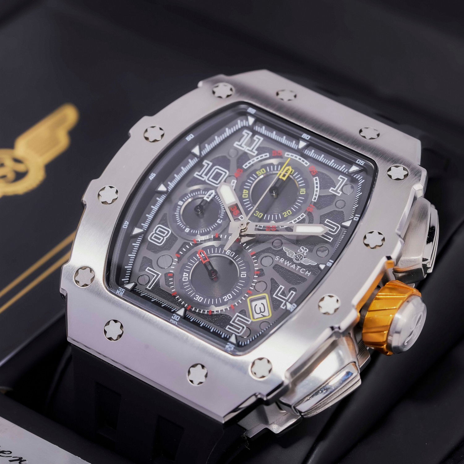 Đồng hồ nam SRWATCH SG88881.4101SP mặt đồng hồ thiết kế thể thao hiện đại. Vỏ đồng hồ được gia công tỉ mỉ với các điểm nhấn là ốc hình sao 6 cạnh bao quanh mặt với độ hoàn thiện cao tạo nên sự mạnh mẽ. Dây đeo bằng cao su co giản tạo sự thoả mái. Đồng hồ có 3 kim chính cơ bản hiện thị giờ, phút, giấy. Đồng hồ có chức năng chronograph (giờ, phút, giây) thể thao thể hiện bằng 3 mặt đồng hồ nhỏ trung tâm. Kèm theo cửa sổ lịch ngày thuận tiện cho việc sử dụng. Mặt kính sapphire chống xước cao cấp, đạt tiêu chuẩn chống nước 5ATM, đảm bảo sự an tâm cho người đeo.