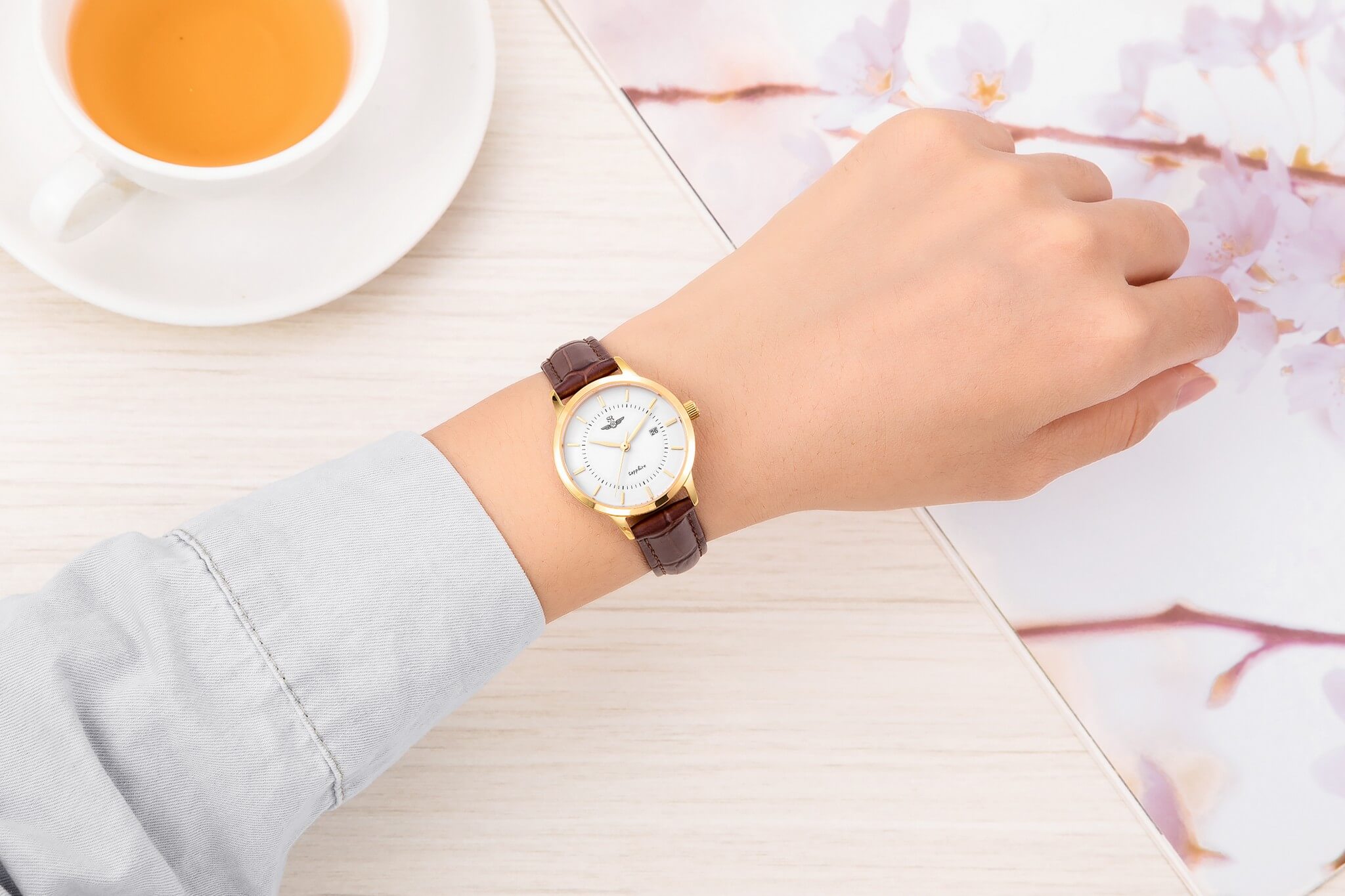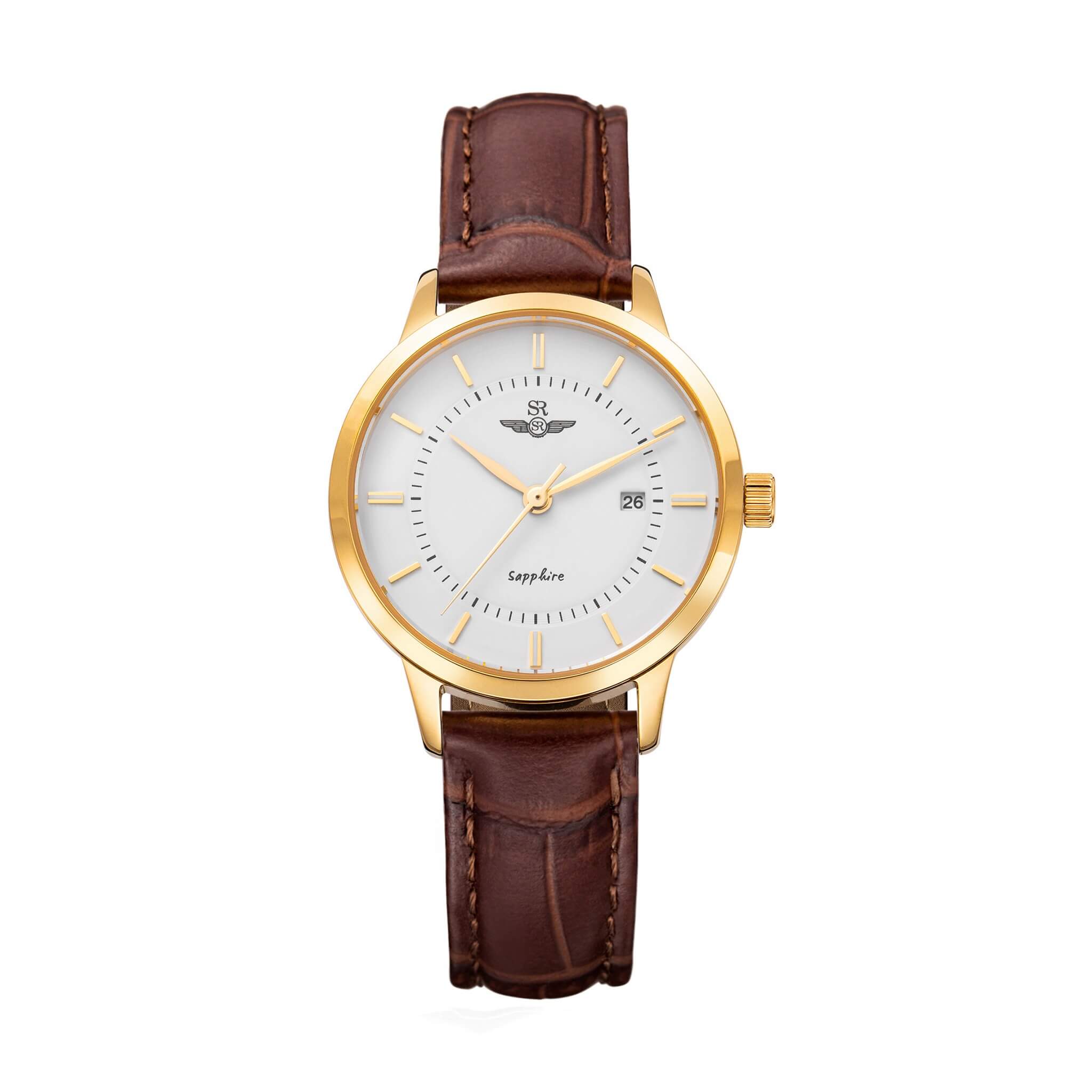 Đồng hồ nữ SRWATCH SL3007.4602CV trắng, mặt tròn, sang trọng, lịch lãm với dây da nâu và vỏ máy chất liệu thép không gỉ được mạ vàng công nghệ PVD giúp chống bong tróc lớp xi mạ, 3 kim thanh mãnh và các cọc số đều được mạ vàng nổi bật, sắc nét trên nền đồng hồ màu trắng sang trọng, mặt kính sapphire cao cấp chống trầy, có 1 lịch ngày đi kèm, chống nước tiêu chuẩn 5ATM.