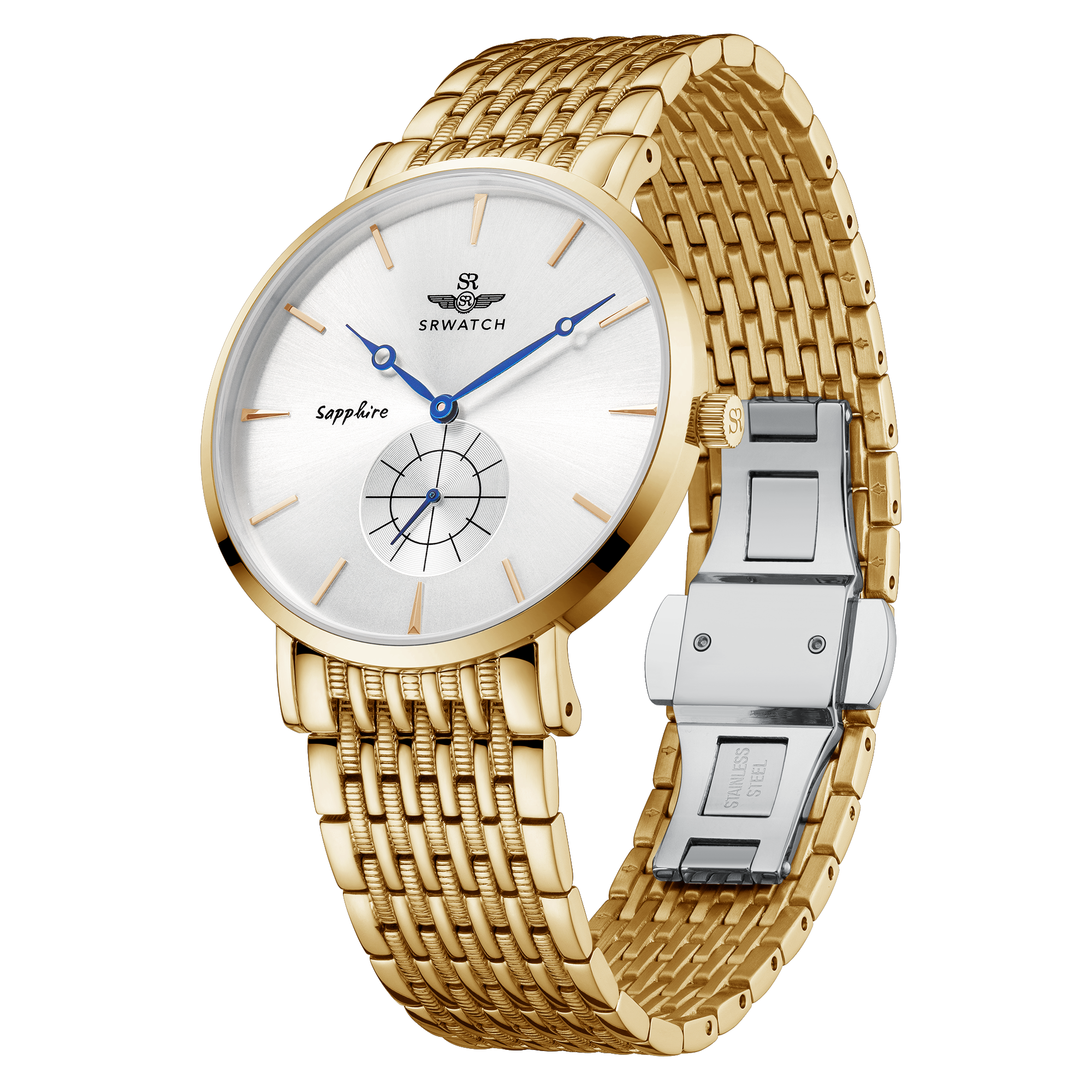 SRWATCH SG1077.1402 TE gây ấn tượng với thiết kế mặt tròn nền trắng tinh tế, tôn lên vẻ lịch lãm và đẳng cấp của quý ông hiện đại. Vỏ và dây thép không gỉ được mạ vàng công nghệ PVD cao cấp được hoàn thiện chắc chắn, tạo cảm giác sang trọng và bền bỉ theo thời gian.Mặt số tối giản, hài hòa cùng kim xanh thanh thoát và vạch giờ sắc nét, mang lại vẻ đẹp trang nhã nhưng đầy cuốn hút. Đồng hồ được trang bị kính sapphire chống trầy xước và khả năng chống nước 5ATM, đảm bảo sự an tâm trong quá trình sử dụng hằng ngày.