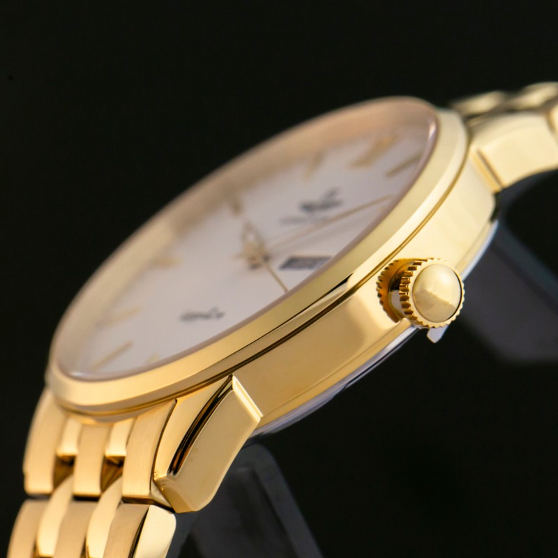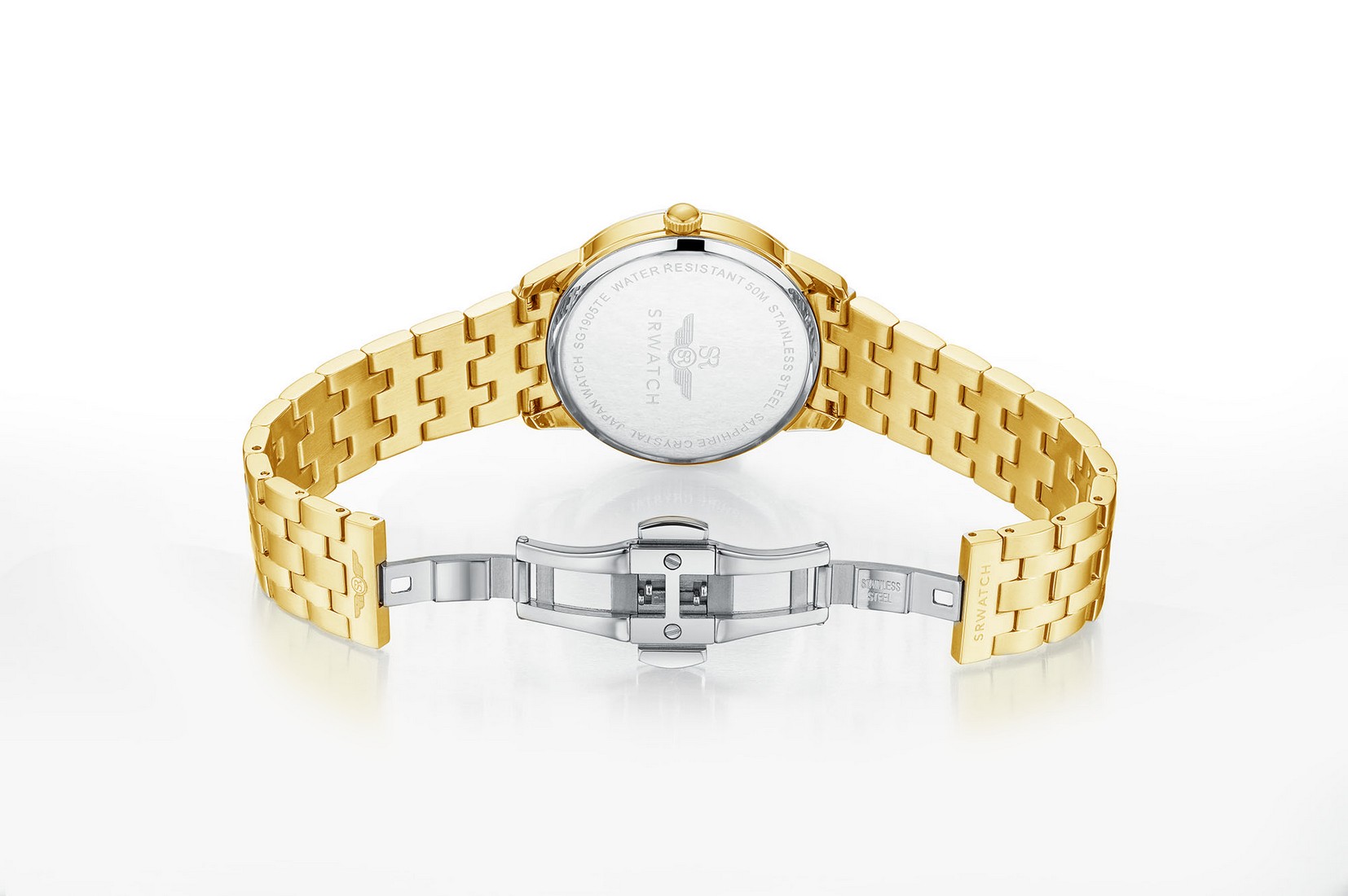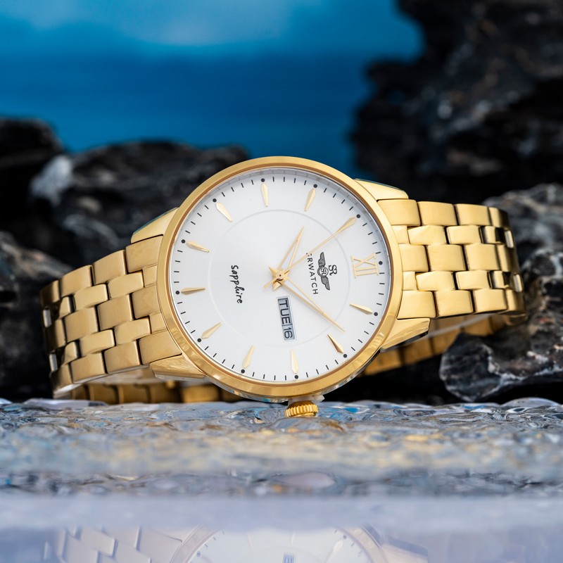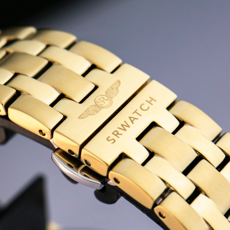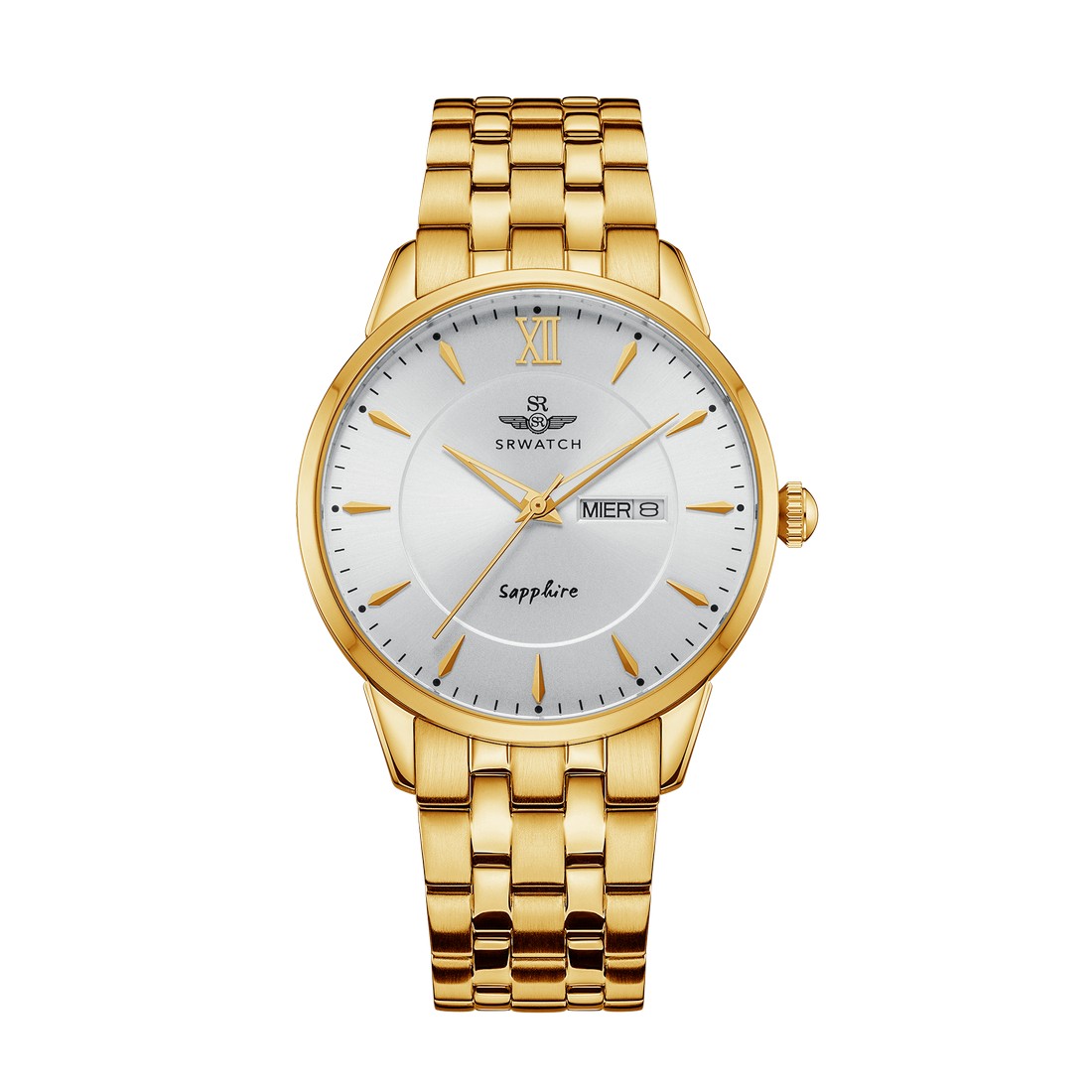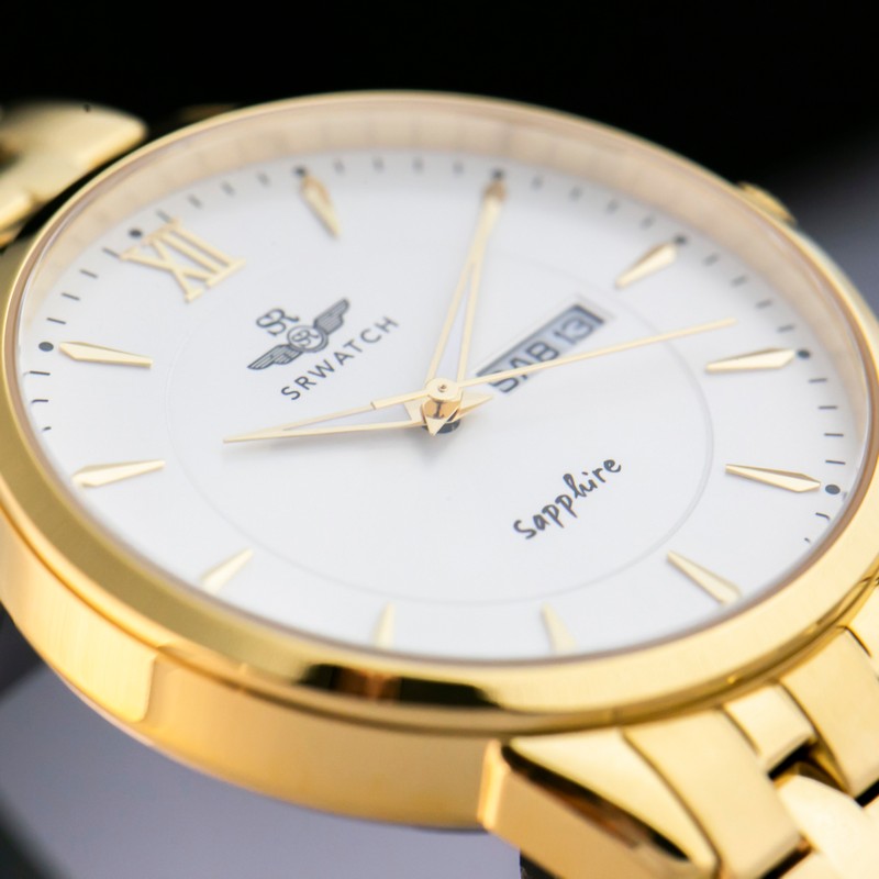 Đồng hồ nam SRWATCH SG1905.1402TE với thiết kế mặt tròn, cùng với dây đeo kim loại, cùng với điểm nhấn với số la mã vị trí 12h mang lối thiết kế hiện đại, mạnh mẽ. Vỏ đồng hồ, dây đeo, và các cọc số được gia công tỉ mỉ từ thép không gỉ mạ vàng công nghệ PVD. Đồng hồ với 3 kim và cửa sổ hiện thị 2 lịch tạo thuận lợi khi sử dụng. Mặt kính sapphire cao cấp chống trầy cùng với tiêu chuẩn chống nước 5ATM đảm bảo mang đến sự an tâm cho người đeo.